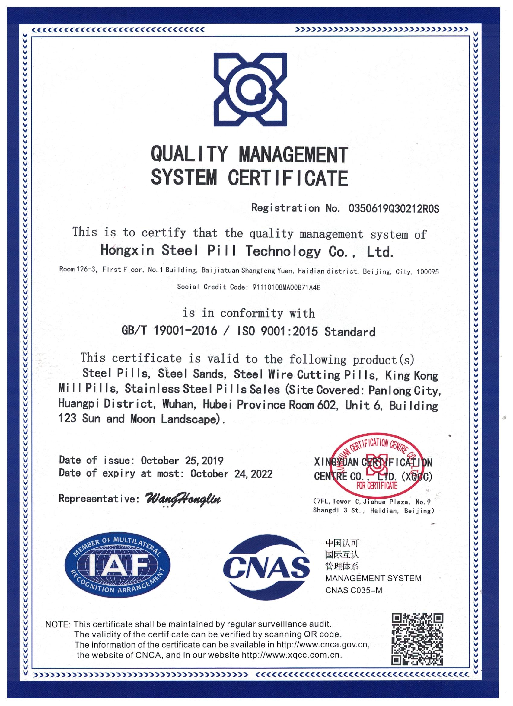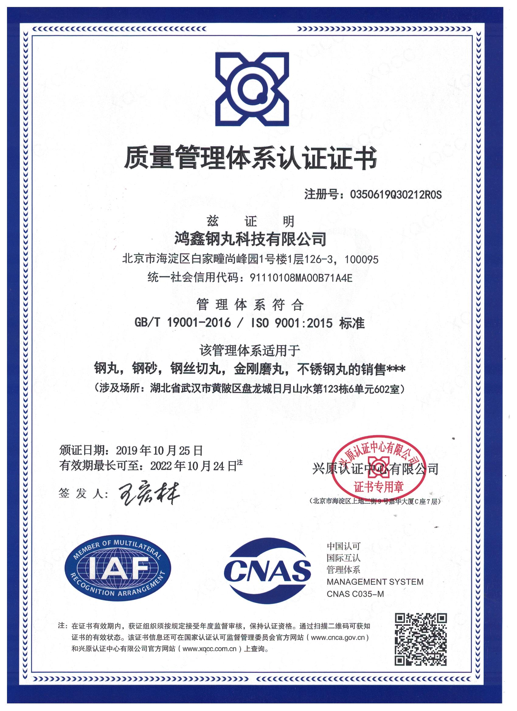 11月12日,歷時(shí)3個(gè)多月的申報(bào),鐵米鋼丸獲得興原認(rèn)證證書,此證書證明我們鐵米鋼丸管理體系符合GB/T19001-2016,ISO9001-2015標(biāo)準(zhǔn),該管理體系適用于鋼丸,鋼砂,鋼絲切丸,金剛磨丸,不銹鋼丸的銷售。